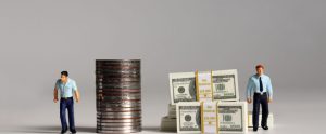 A pile of bills and coins. Miniature people. A concept of income